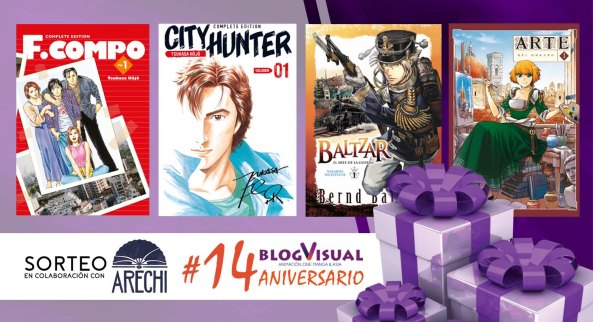 Desde Arechi se suman a la celebración de nuestro 14º Aniversario y para ello nos han cedido un fantástico lote compuesto por los primeros tomos de «City Hunter» (Complete edition) y «F. Compo» (Complete edition) de Tsukasa Hôjô, «Arte» de Kei Ohkubo y «Baltzar, el arte de la guerra» de Nakajima Michitsune. No podemos más que agradecer a la editorial el apoyo y su participación en nuestro evento, así como desearos mucha suerte a quienes participéis, porque es un fantástico lote para iniciarse en estas cuatro series.