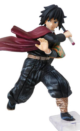 Limitada hasta agotar existencias, esta imponente figura de 15 cm. de altura llega presentada en una preciosa caja contenedora (con medidas 17 x 22 x 22 cm.) decorada para la ocasión, en cuyo interior encontramos la figura de una sola pieza y la pieza soporte para que quede estabilizada en el pie izquierdo. Como podéis ver tiene una pose estilizada, una postura estática pero muy lograda y con un el dinamismo que le aporta el movimiento de la capa (haori) y la pose firme de ataque con la katana nichirin desenvainada. El detalle es fantástico, tanto en la propia espada (a pesar del tamaño, desde la empuñadura hasta la hoja bicolor y los kanjis grabados en ella) como en el propio traje: botones, cinturón, cintas en las piernas (que en esta versión adquieren tonalidad marrón del desgaste y la suciedad de la batalla) o el haori bicolor (con la mitad en tonalidad granate y la otra con el patrón de color y estampado del personaje en cubos). La figura se nos presenta pre-pintada, estática, fabricada en PVC y con ABS en packaging cerrado. Para su exposición cuenta con un soporte transparente para estabilizar y evitar caídas y, de paso, colocarla junto al resto de personajes que vayan formando parte de nuestra colección de «Kimetsu no Yaiba«. Esperamos seguir mostrando otras más de la serie, como ya hicimos con la espectacular figura de Kyojuro Rengoku, el pequeñín Tanjiro Kamado Q-Posket Petit. o más recientemente la Ichibansho de Nezuko Kamado – Mugen Train.