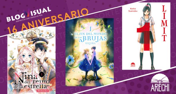 Desde Arechi Manga se suman a la celebración de nuestro 16º Aniversario y para ello nos han cedido los tomos nº1 de tres fantásticas series como son “Limit” (リミット) de Keiko Suenobu, “Nina del reino de las estrellas” (星降る王国のニナ) de Rikachi y “El fin del mundo de las brujas” (世界の終わりと魔女の恋) de Kujira. No podemos más que agradecerles el apoyo y su participación en nuestro evento una edición más, así como desearos mucha suerte a quienes participéis.