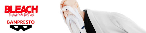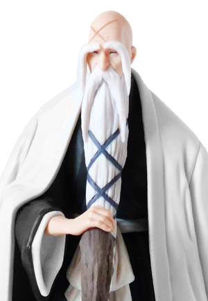 Limitada hasta agotar existencias, esta figura de 15 cm. de altura llega presentada en una preciosa caja contenedora (con medidas 12 x 18 x 9 cm.), en cuyo interior encontramos la figura en una pieza (cuerpo completo), junto a su bastón y la base para exponerla. Como podéis ver, al igual que el resto de figuras de esta serie, tiene una pose estilizada, con una postura estática pero muy lograda. La figura destaca detalles de la apariencia del personaje, como que por la edad va algo encorvado, su barba canosa extremadamente larga y trenzada con un cordel morado, la reconocible marca en forma de X que tiene en la frente o el grueso bastón en el que se apoya, sin olvidar algo tan importante como la cara y su expresión. Sus ojos están entrecerrados y tiene unas pobladas cejas que caen a ambos lados de su rostro. El traje de shinigami (Shihakusho) mantiene el diseño de los capitanes, de color negro, pero a diferencia del resto no tiene retoque alguno. Viste un haori blanco propio de los capitanes de división, en su caso de mangas largas, y que se coloca a modo de manto o capa. En la espalda lleva el kanji con el número de su escuadrón y no muestra su zanpakutô. Por lo demás, como decimos guarda bastante sencillez en su vestimenta y serenidad en su apariencia, con los calcetines tabi de color blanco y las sandalias zōri de tono dorado.